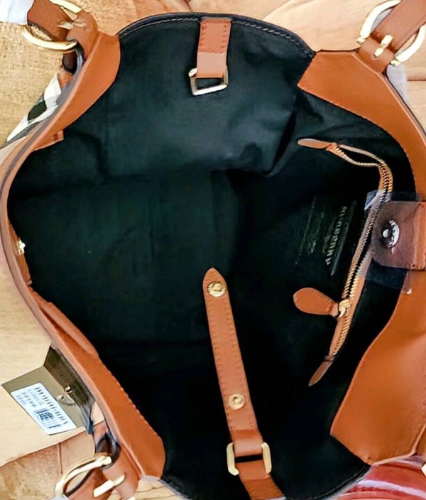 Spacious burberry tote made of genuine leather and canvas. Adjustable strap compliments this beatiful one of a kind handbag that comes with a gorgeous silk scarf.