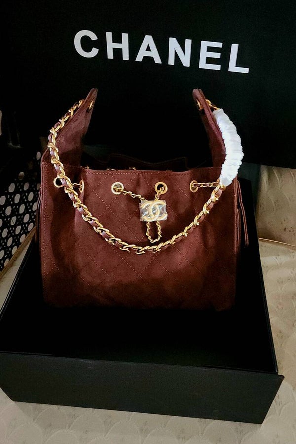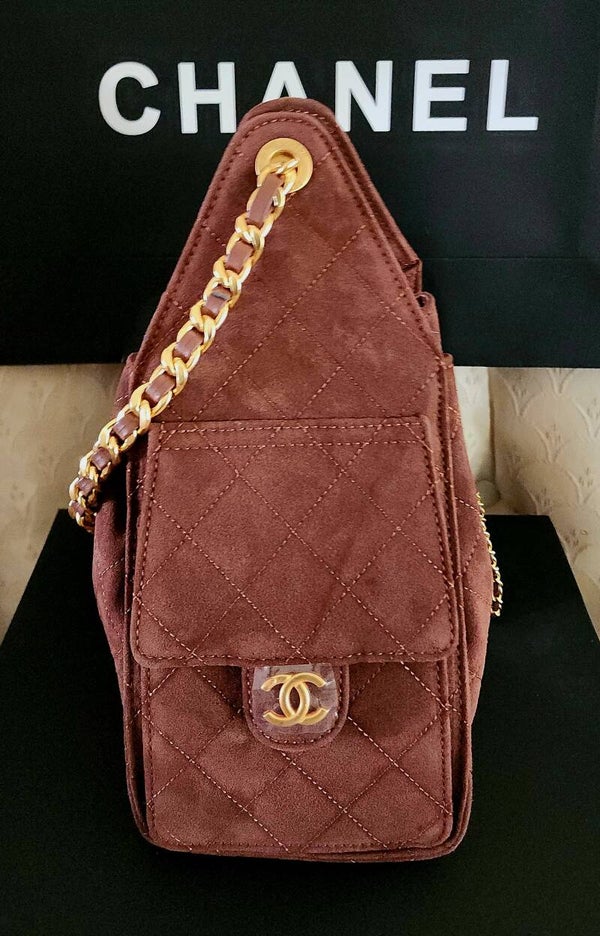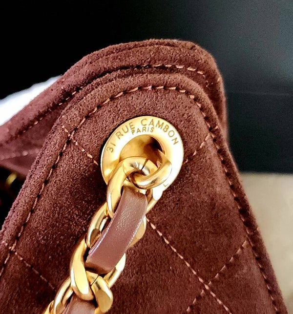 Suede calfskin and gold-tone metal. Dark brown. Dimensions; 11.8"X10.2"X5.5" Inches.