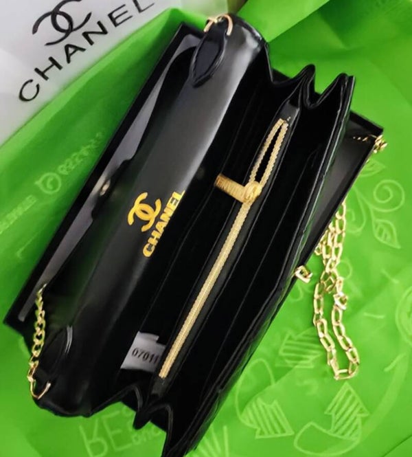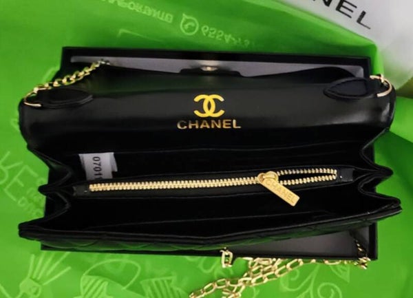Grained shiny calfskin ith gold-tone metal hardware Chanel Pocketbook, with gold chain and inside zipper pocket.