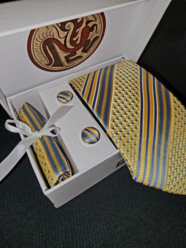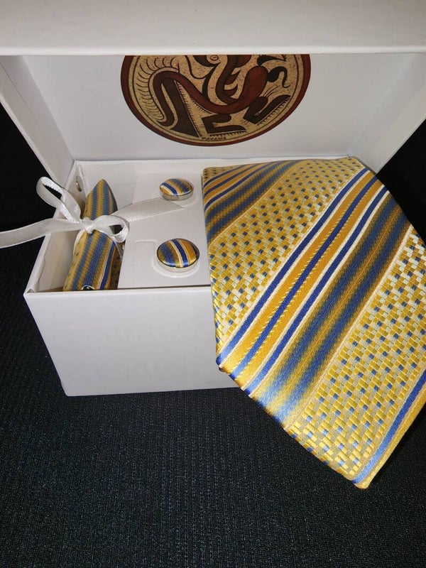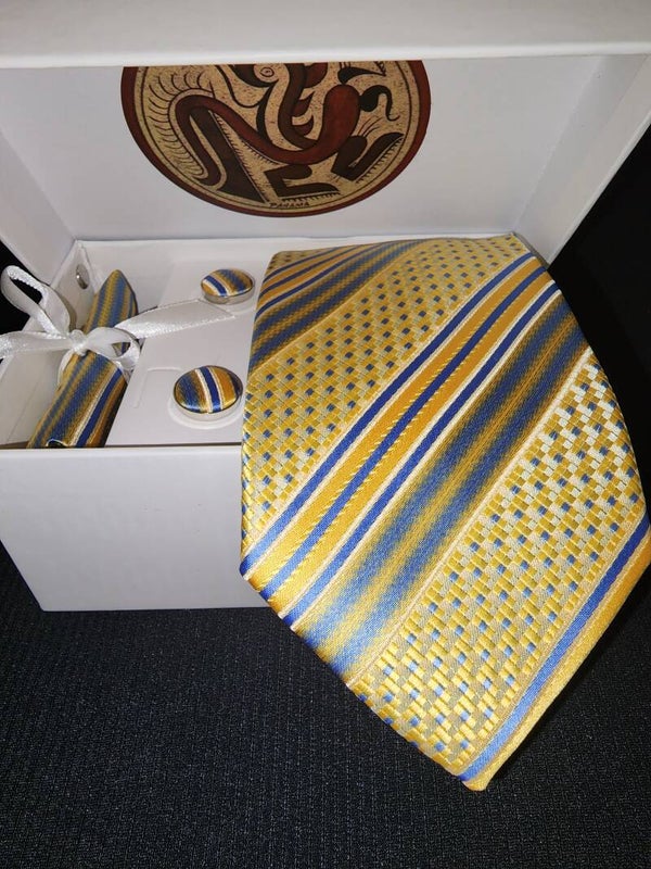Yellow-Blue Stripe 100% silk necktie pocket square with cufflinks set.