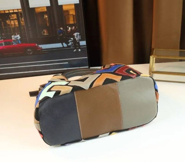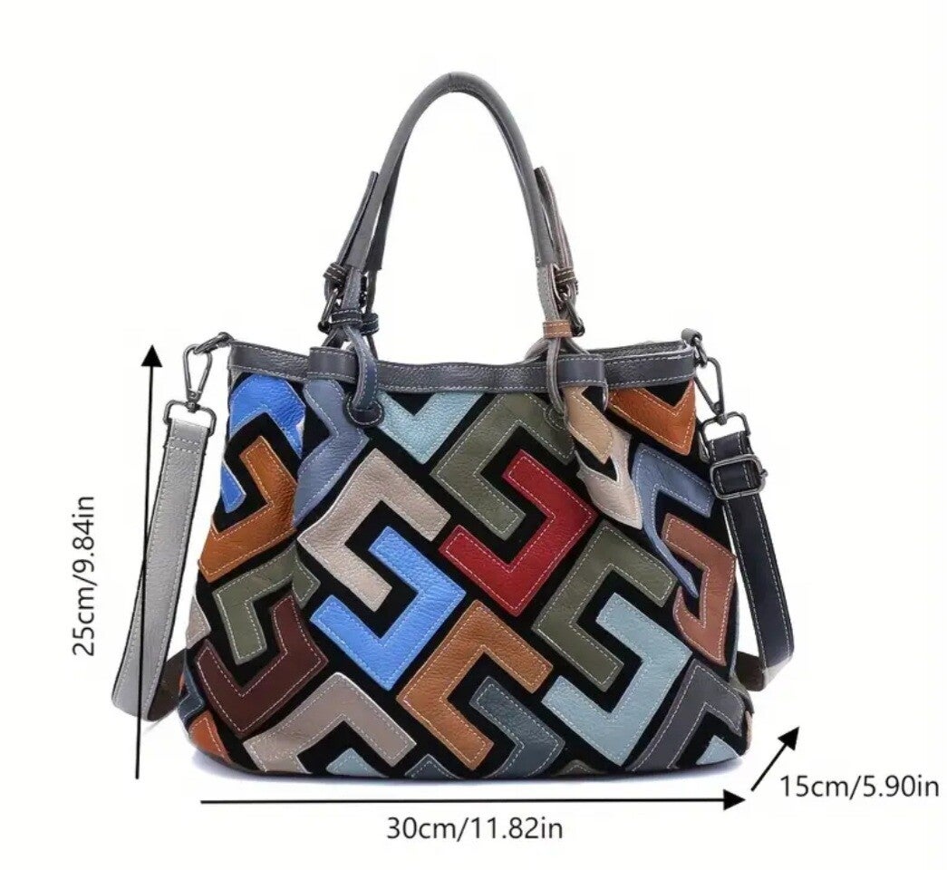 Genuine Leather Tote Handbag with large capacity multicolor geometric pattern with detachable strap, gold-tone hardware and zipper closure.