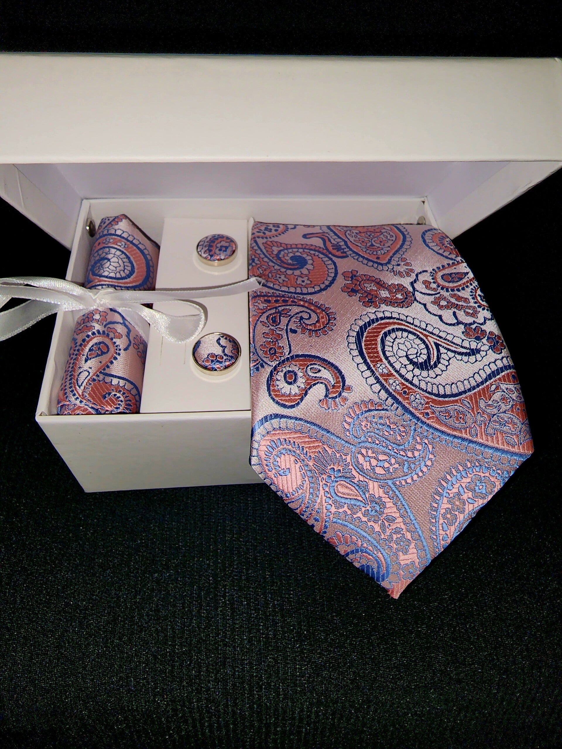 100% silk paisley necktie handkerchief cufflinks set.